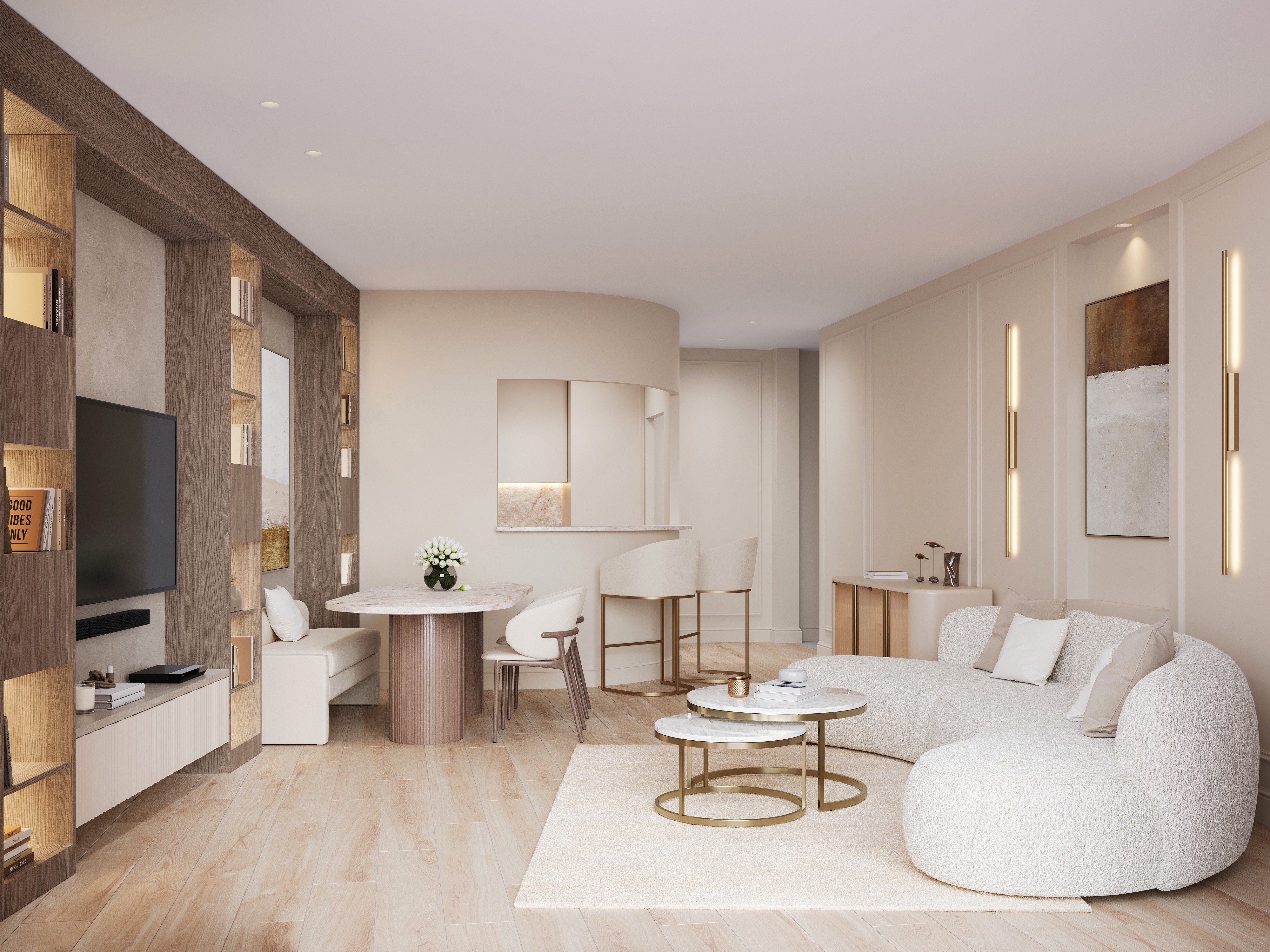 The custom kitchen is crafted with premium Italian cabinetry, integrated appliances, and discreet storage solutions. Both bedrooms include en-suite bathrooms and walk-in wardrobes, built to measure using refined natural materials and soft neutral tones.